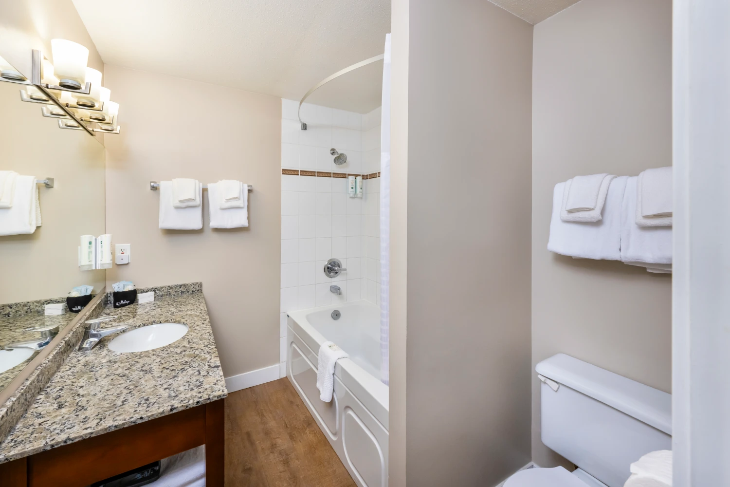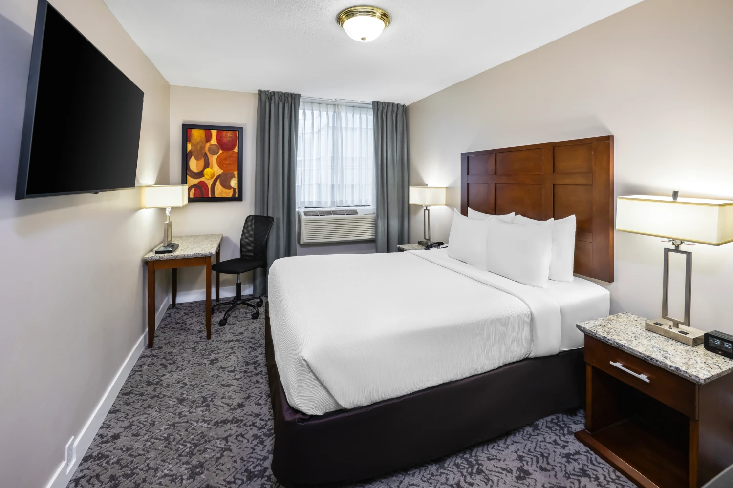 This comfortable room includes one Queen bed with a pillow-top mattress and premium linens. Enjoy a 42” flat-screen HDTV, as well as granite countertops, a private bathroom with amenities, and a coffee maker.